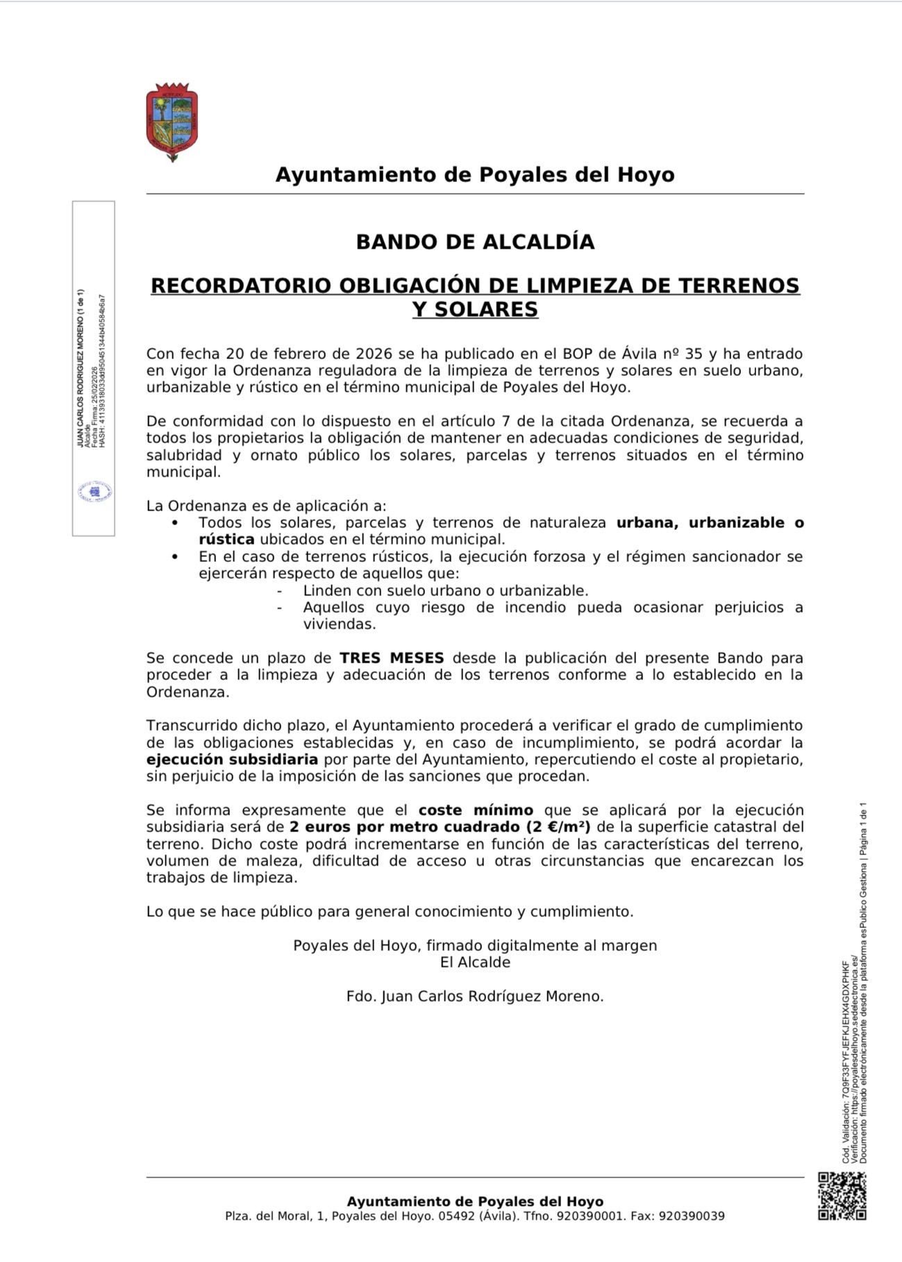El Ayuntamiento de Poyales del Hoyo informa que con fecha 20 de febrero de 2026 ha entrado en vigor la Ordenanza reguladora de la limpieza de terrenos y solares (publicada en el BOP de Ávila nº 35).